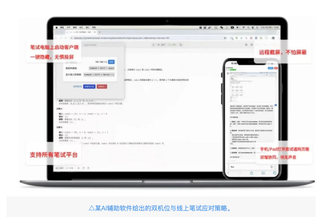 据央广网报道,有记者实测了这类软件。在“双机位”(正面和侧后方)监控的模拟面试中,记者将运行软件的手机物理隐藏后,AI助手能在约1秒内生成回答,且从监控视角完全无法察觉。