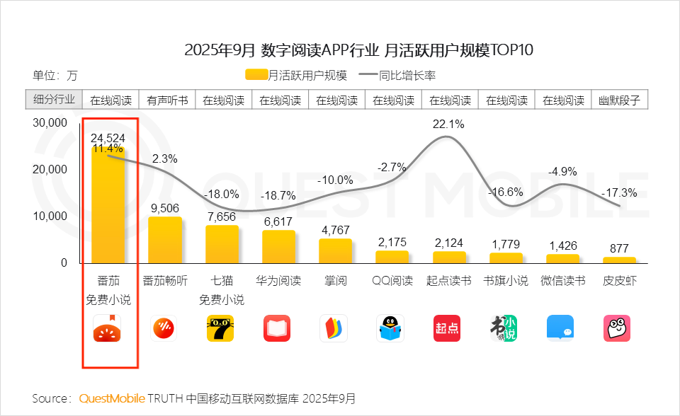 自2019年番茄小说上线以来,凭借免费+广告的模式快速打开市场,占领规模高地,据Quest Mobile数据,截止2025年9月,番茄免费小说APP月活跃用户规模达2.45亿,同比提升11.4%,持续领跑数字阅读行业。在内容端口,番茄小说目前已有超过60万签约作家,签约作品超78万部,版权库内容超150万部,形成了一个庞大且多元的内容创作生态。