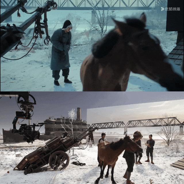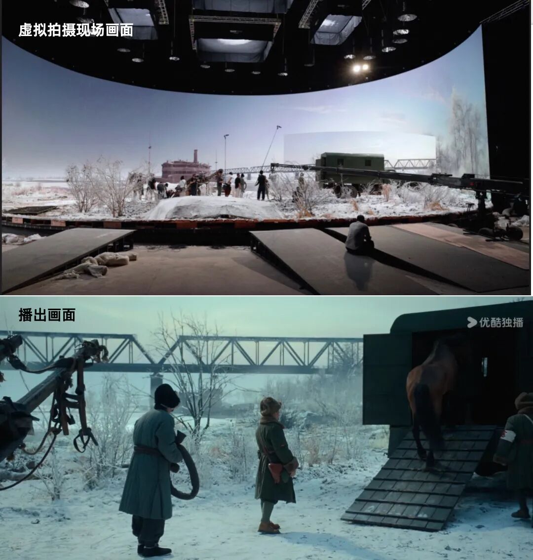 演员在虚拟棚内搭建的雪原上咯吱行走,背后虚拟大屏已经从钢铁火车轨道,换成了汽笛轰鸣的轮船。
