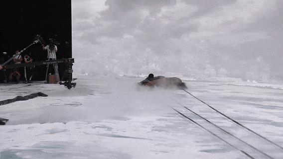 这种戏份很精彩,但在实拍中,也往往意味着更高的拍摄难度、时间、成本,演员本人也要冒着一定危险。所以最后,这场戏是完全在虚拍棚里完成的。