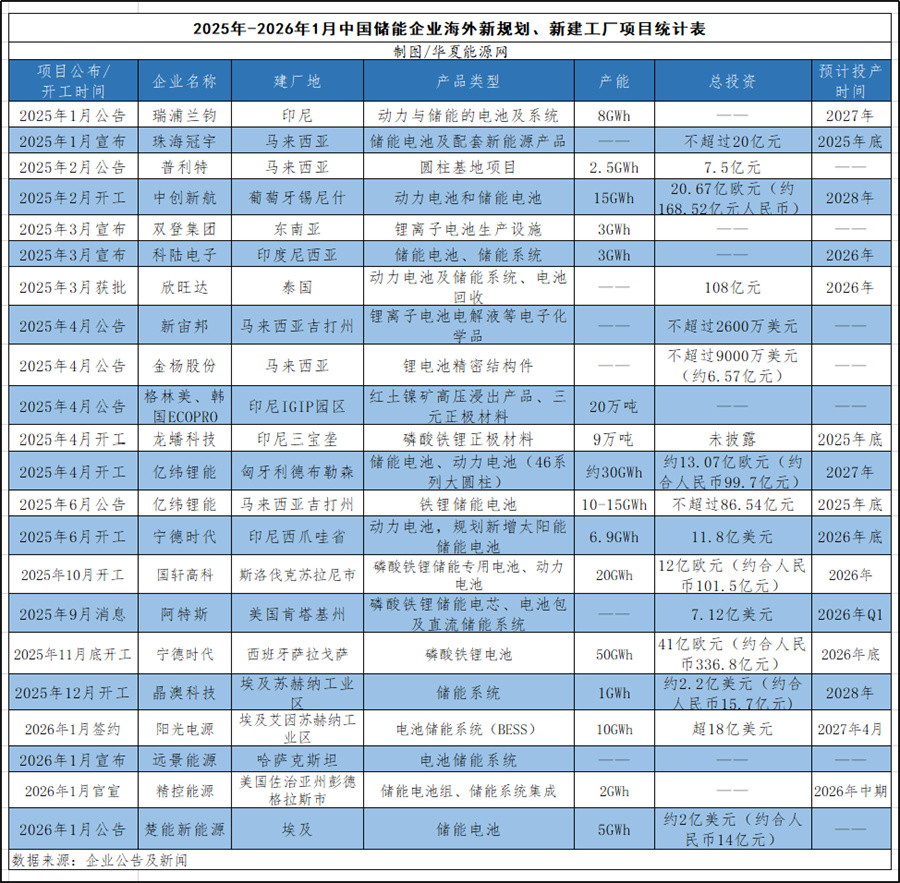 华夏能源网不完全统计,2025年至2026年1月,共有22个海外储能制造项目公布或开工建设,覆盖东南亚、中东、中亚、美国、欧洲等地区,合计涉及产能超过166GWh,涉及总投资超1223亿元。