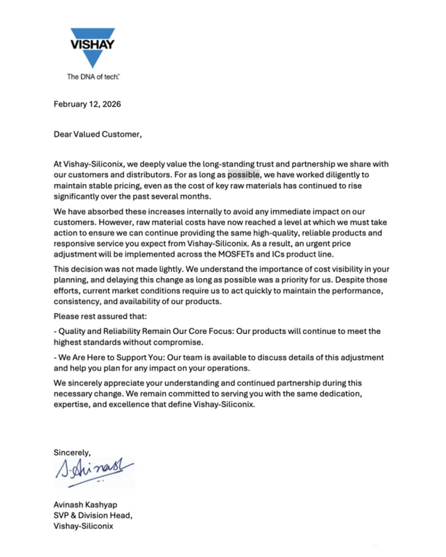 全球分立半导体与无源元件龙头Vishay亦传出涨价消息。因关键原材料成本持续大幅攀升,公司将对MOSFET 及 IC 产品线实施紧急价格调整,以缓解成本压力、保障供应稳定。