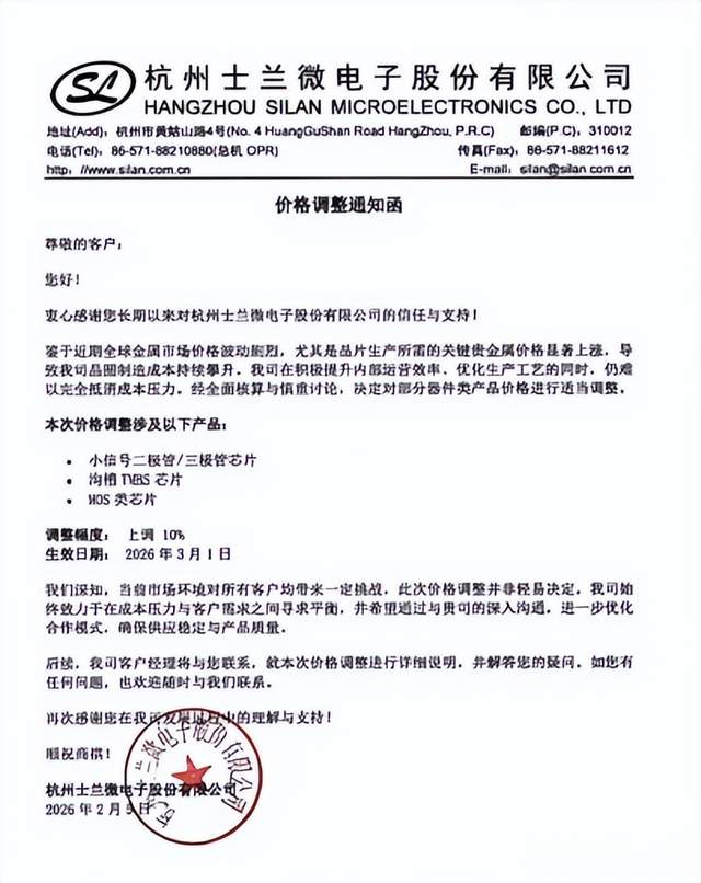 2月5日,杭州士兰微电子股份有限公司向客户发布《价格调整通知函》,宣布将对部分器件类产品价格进行上调,调整幅度为10%,自2026年3月1日起正式生效。根据涨价函显示,此次涨价的产品主要涉及三类核心产品:包括小信号二极管/三极管芯片、沟槽TMBS芯片和MOS类芯片。