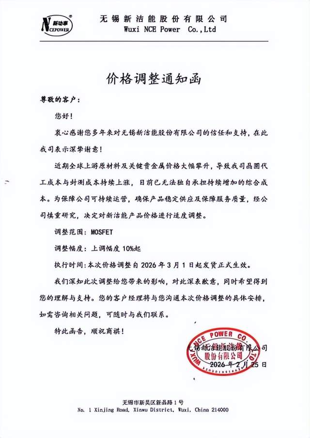 继士兰微、宏微科技后,国产功率半导体厂商新洁能于2026年2月25日发布价格调整通知,宣布对MOSFET产品涨价10%起,3月1日起发货生效。