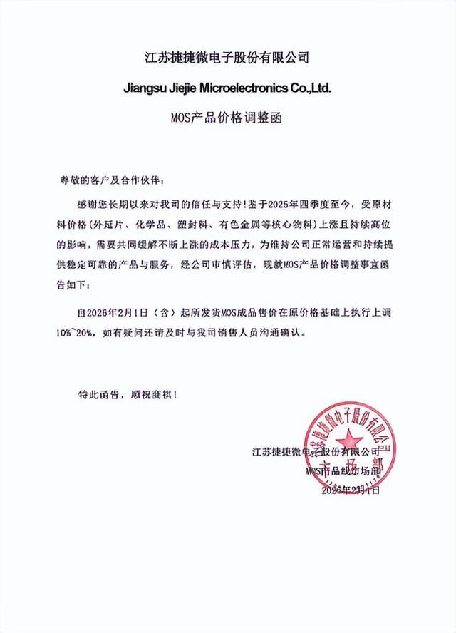 同日捷捷微电宣布,对其MOS系列产品提价10%-20%,自2026年2月1日起,新发MOS成品均按新价格执行。