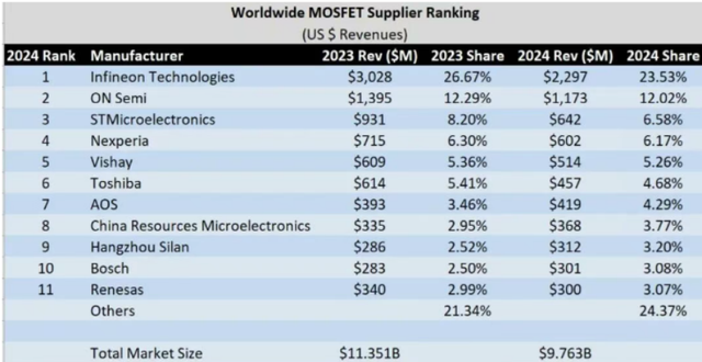 2025年全球功率MOSFET管排名前10的供应商排名暂未披露,但从2024年的排名中可以看到,前十家公司分别为:英飞凌、安森美半导体、意法半导体、恩智浦、安世半导体、威世、东芝、万代半导体、华润微电子、士兰微电子、博世、瑞萨电子。