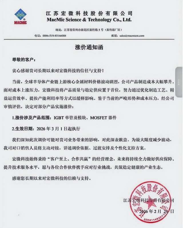 2月24日,宏微科技向客户发出“涨价通知函”,宣布将对IGBT单管及模块、MOSFET器件进行调价,2026年3月1日实施。