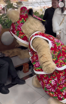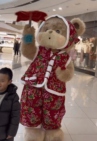来自东三省地域认同的流量拉动了暴暴熊的第一波出圈。在12月底视频出圈后,暴暴熊和多个商场联动,从四平的万达广场出发,它穿着标志性的东北大花袄,开启了东北三省的商场巡游之路。