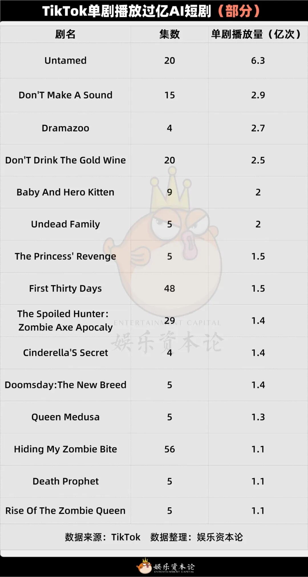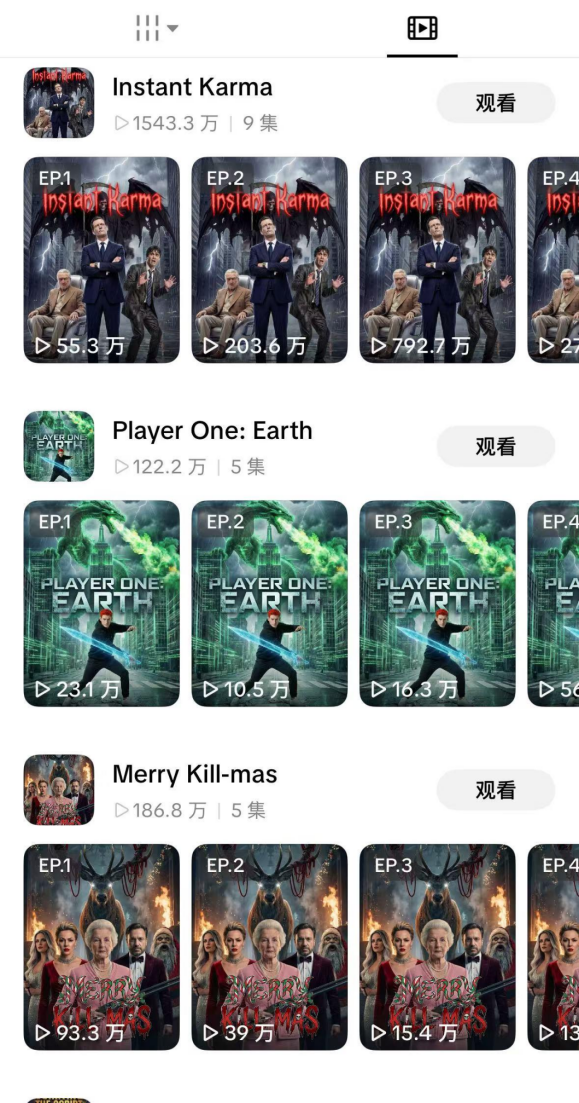 最近的爆款AI短剧《Untamend》就是先上线10集,播放量7天超过3亿次,一个月后又上了10集,现在累计播放量超过6.3亿次。娱乐资本论注意到,在这个账号上,大部分短剧仍然是5-10集的体量,30集以上的短剧寥寥无几。