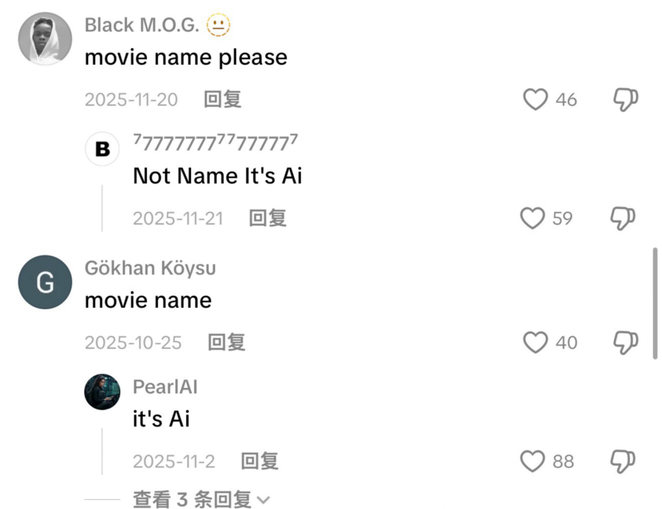 整部剧镜头跳转极快,剧情推进也快,还常常会在结尾留下钩子。评论里,很多人都以为这些视频是某部作品的切片想找完整版,出现最多的评论就是“Movie name,please”,很快就会有人回复他这是AI短片。