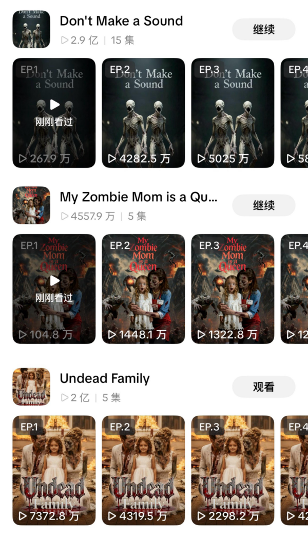 AIGC导演思今的团队就制作过多部播放量过千万次的丧尸题材海外AI短剧,在他看来,丧尸世界中人类生存压力大,看人类在极致环境中逃生对于受众来说有一种解压爽感。“国外观众很喜欢看真善美的情节,特别是与爱、家庭相关的东西,因此所以很多丧尸题材都是父母救孩子、孩子救父母的剧情,甚至情侣互救不如亲子互救的播放量高”。