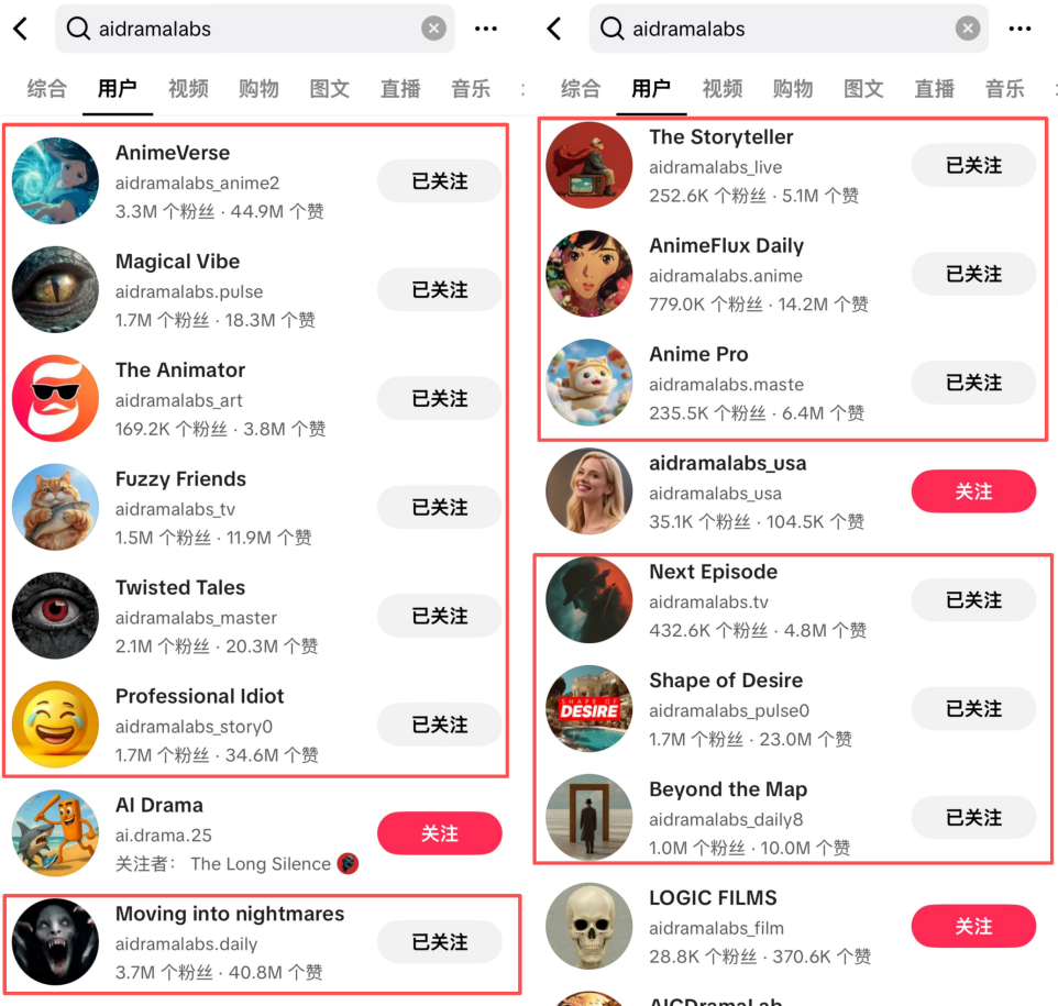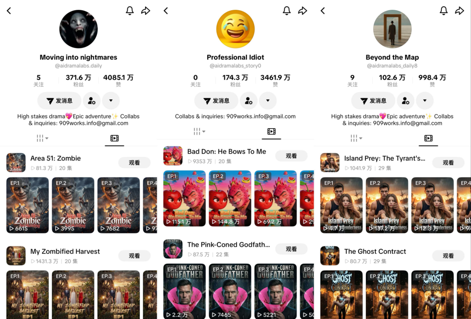 从简介来看,这些用户名中出现“aidramalabs”的十几个账号均来自于同一团队。娱乐资本论了解到,这些账号其实是TikTok内部孵化的官方账号,去年年中就开始向外寻找优质团队进行AI短剧承制。