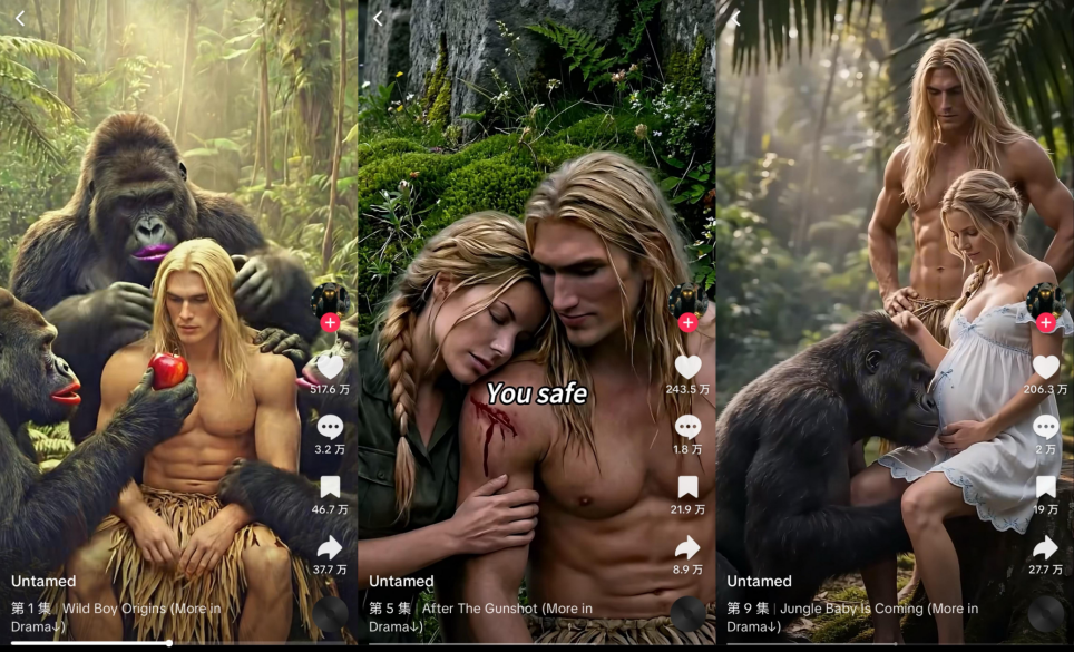 该剧改编自大众熟知的人猿泰山故事。自幼被猩猩抚养长大的男主遇到了前来森林科考的女主,两人相爱并结婚生子,还一起保卫森林抵御外来入侵者。该剧比起早期的5集小故事,已经有了更长、更完整的叙事,集均百万点赞,评论中不少用户表示能看出来是AI制作,但还是看完全集并持续追更。