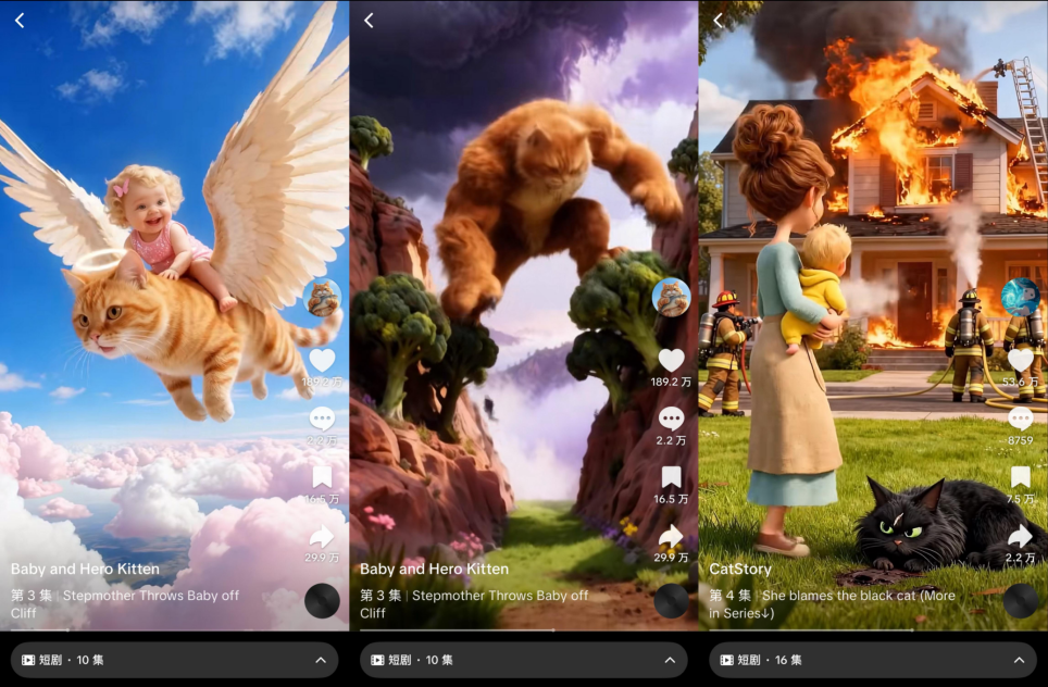 早期海外AI拟真人短剧台词很少,更多依靠大场面与奇幻设定,甚至一部只有5集,第一集大多是整剧的剧情梗概,实际剧情内容不足5分钟。