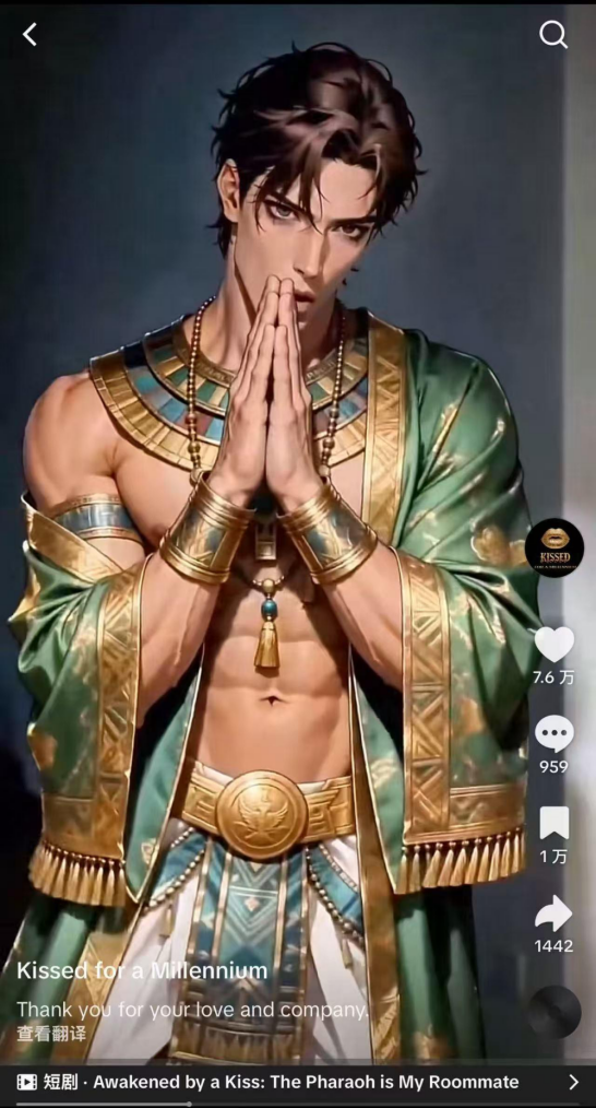 上周TikTok公布的Q1分账战报中,盛影文化制作的女频AI漫剧《Awakened by Kiss:The Pharaoh is My Roommate》(我的室友是法老)位列其中。故事讲述在古董仓库工作的Ella被男友Jason的前任当众羞辱。为了取乐,对方逼她去亲吻一尊古老的法老雕像,却没想到这一吻竟意外唤醒了沉睡千年的神秘诅咒。
