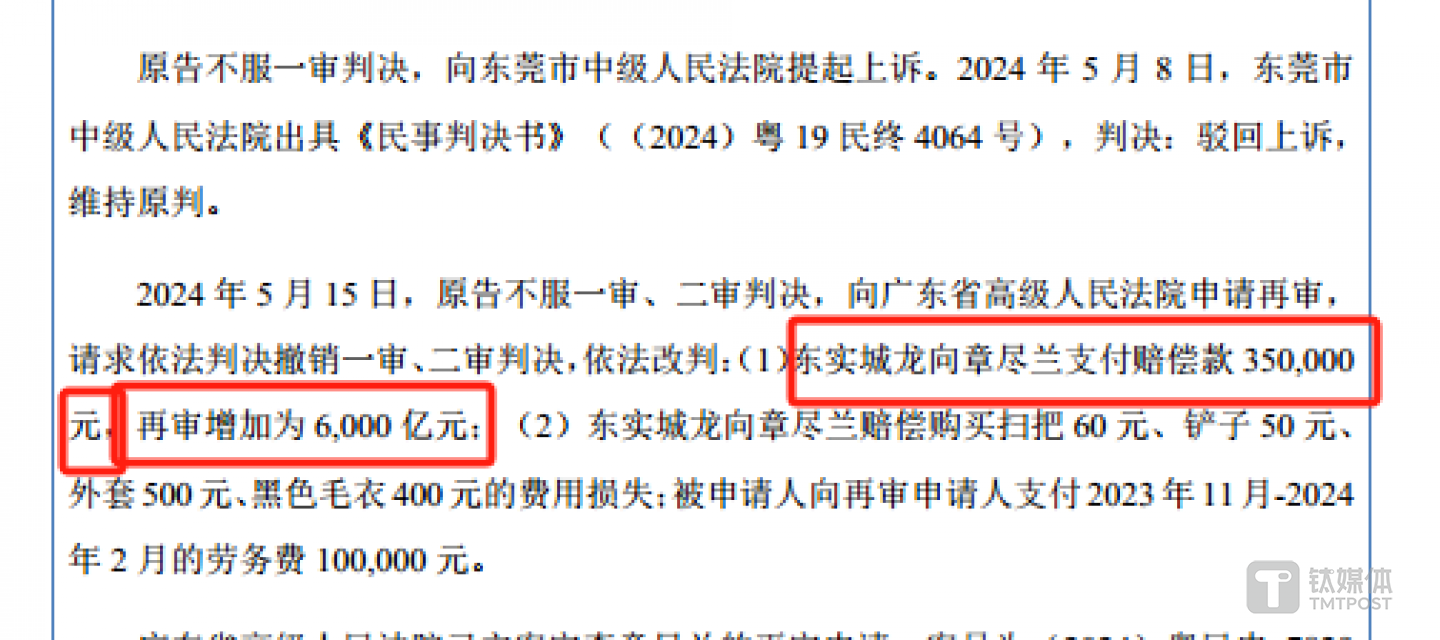 正当大家都认为该案件就此告一段落时,章尽兰却不服一审、二审判决,2024年5月15日,章尽兰再次向广东省高级人民法院申请再审,诉讼请求也依法改判:(1)东实城龙向章尽兰支付赔偿款35万元,再审增加为6000亿元;(2)东实城龙向章尽兰赔偿购买扫把60元、铲子50元、外套500元、黑色毛衣400元的费用损失;被申请人向再审申请人支付2023年11月-2024年2月的劳务费10万元。
