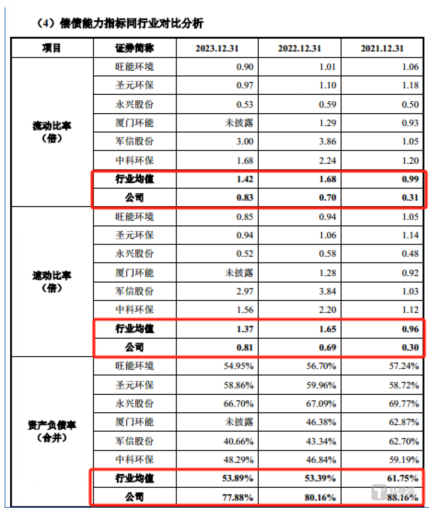 其次,报告期内,东实环境的流动比率分别为0.31倍、0.7倍、0.83倍,同行可比公司平均值分别为0.99倍、1.68倍、1.42倍;速动比率分别为0.3倍、0.69倍、0.81倍,同行可比公司平均值分别为0.96倍、1.65倍、1.37倍;资产负债率分别为88.16%、80.16%、77.88%,同行可比公司平均值分别为61.75%、53.39%、53.89%。