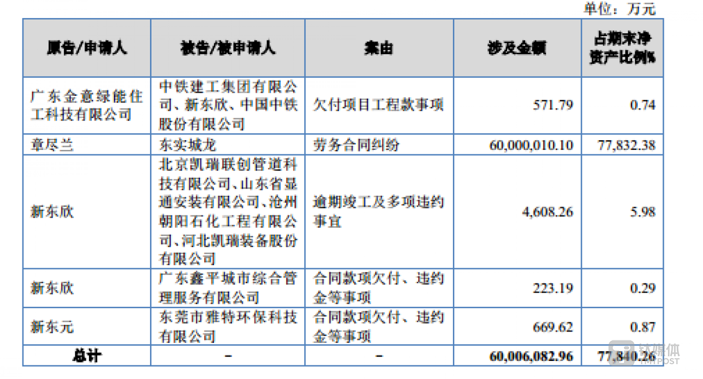 公司不仅仅要面临巨大的债务压力,钛媒体APP注意到,东实环境及其子公司还存在不少的诉讼案件,具体情况如下: