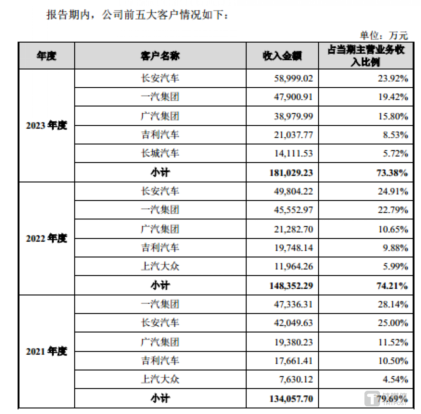 需要指出的是,毓恬冠佳之所以能实现上述的业绩主要是依赖公司的前五大客户。报告期内,毓恬冠佳向前五大客户产生的销售收入分别为13.41亿元、14.84亿元、18.1亿元,分别占当期主营业务收入的79.69%、74.21%、73.38%,长安、一汽、广汽、吉利等一众知名汽车企业皆是毓恬冠佳的客户。