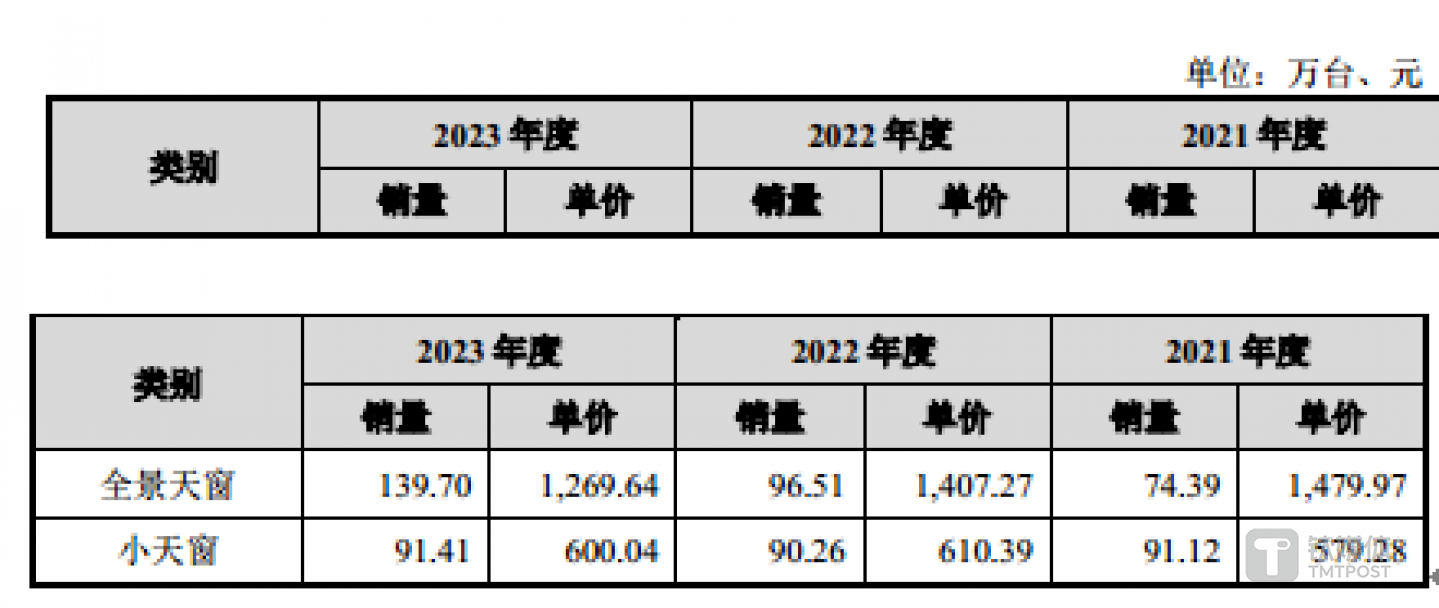 全景天窗的销量和单价具体如下: