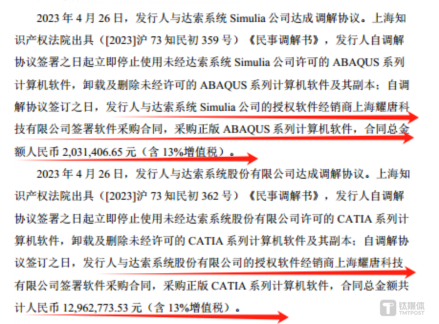 2023年4月,毓恬冠佳与达索系统达成和解协议,毓恬冠佳停止、卸载及删除上述未经许可使用的相关软件,并随后向达索系统及其相关公司的授权软件经销商上海耀唐科技有限公司采购了近1500万元的相关计算机软件。