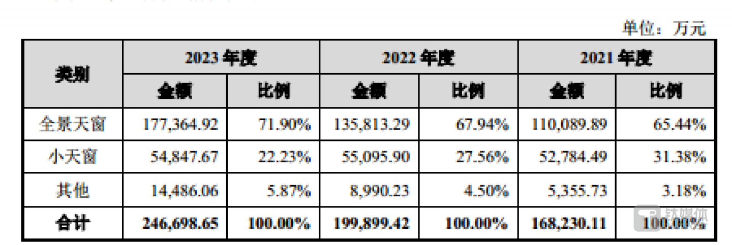 从产品上看,毓恬冠佳主要生产全景天窗、小天窗等产品,具体情况如下: