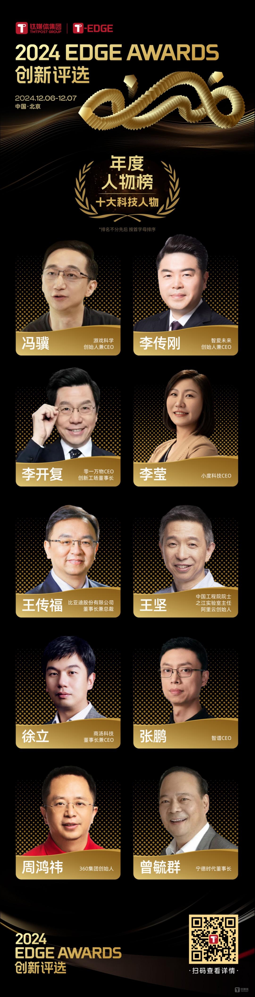 他们不仅在人工智能、大数据等关键技术领域取得了令人瞩目的成就,更将科技成果转化为推动社会进步的强大动力。12月6-7日,2024 T-EDGE创新大会暨钛媒体财经年会在北京市大兴区如期举办。会上,钛媒体重磅发布了「2024 EDGE AWARDS 创新评选」结果。其中「年度十大科技人物」在会上一经发布也引起了大家的广泛关注。现在,钛媒体将该评选详情正式公布。