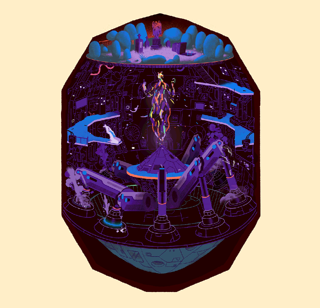 Pawlowski设想这一过程是缓慢且不易察觉的。曾几何时,人类的协作服务于自身目的,而今这种协同效应却被劫持,催生出凌驾众生的超人类格式塔。一种无实体的“生命”形式逐渐凝聚,如同蚁丘。虽然人类最初制造机器是为了服务于人类的目标,却渐成饲喂机械的宿主。人们没有注意到这一变化,当集体劳作悄然蜕变为维系这个新兴生物机械”有机体”的养料,最吊诡的真相浮现:这个褫夺人类”世界主权”的寄生生命体,自身却是”无意识的幽灵”。它既无具象形骸,亦无主观体验,如同盲目、阴郁、植物性的独裁者——一只将人类裹挟为巨体细胞的行星杜鹃。Pawlowski将这个新兴的“利维坦”描述为”超越人类的存在,如同庞然巨躯的细胞般包裹众生。”
