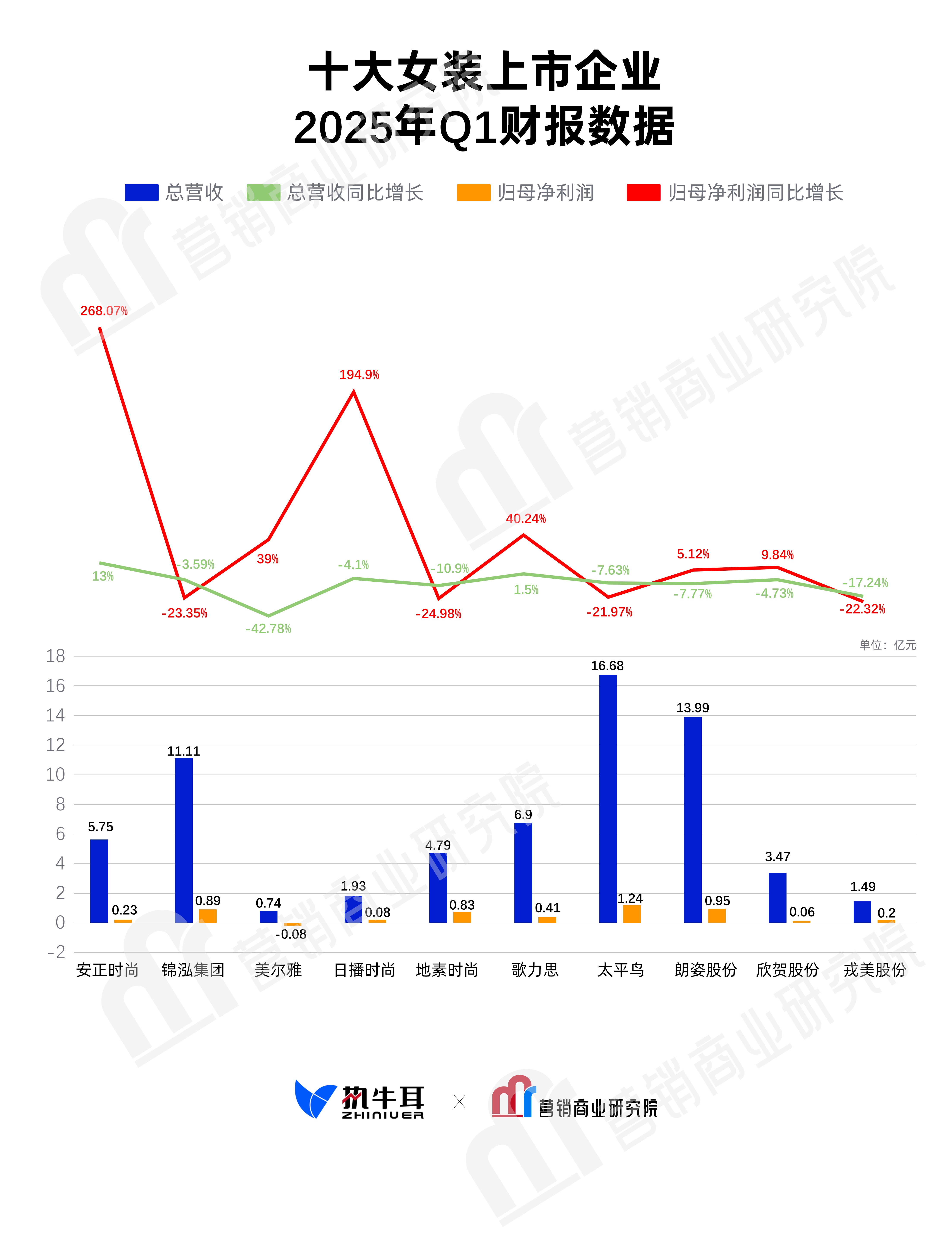近期,安正时尚、锦泓集团、美尔雅、日播时尚、地素时尚、歌力思、太平鸟、朗姿股份、欣贺股份、戎美股份均发布了2025年的第一季度财报。