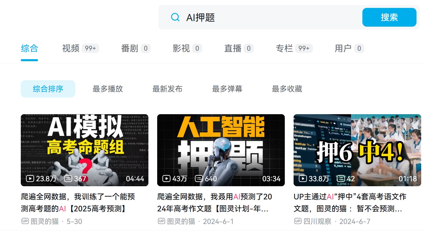 微信指数关于“AI押题”的搜索热度最高峰达到近60万。B站上一位用AI预测高考作文题的UP主“图灵的猫”最近一条关于“AI模拟高考命题组”的视频达到近24万的播放量。