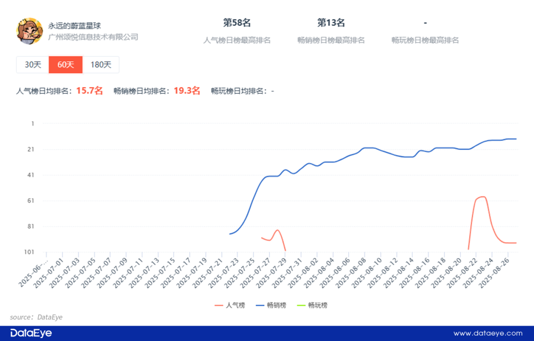 小游戏《永远的蔚蓝星球》在7月末上线微信小游戏,随后快速攀升。截至8月31日,《永远的蔚蓝星球》排名微信小游戏第14名。