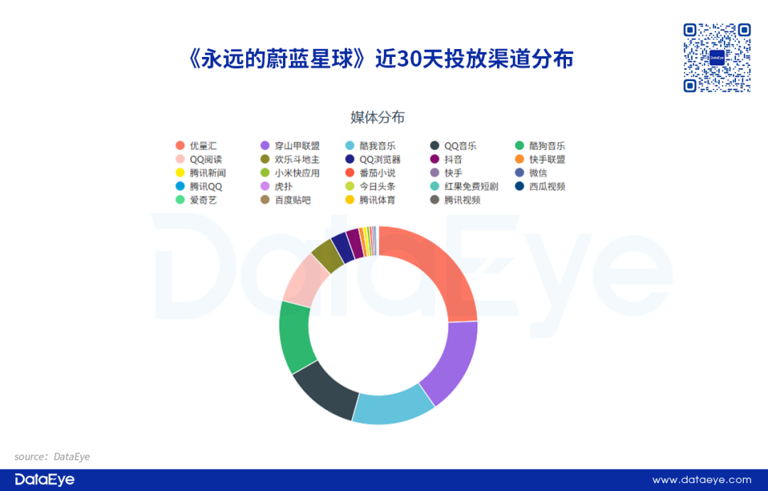 DataEye-ADX投放数据显示,《永远的蔚蓝星球》近30天投放渠道中,聚合类平台是主要投放渠道,优量汇占比24%,而穿山甲联盟占比约16%,二者合计超过40%。