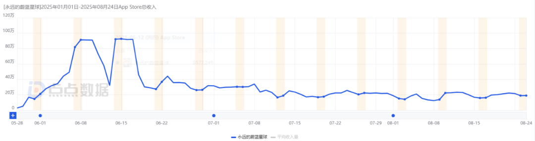 《永远的蔚蓝星球》手游端收入表现整体可观,首月表现强势。点点数据显示,该游戏在上线首日仅排名iOS畅销榜第110名,但是在上线两周后就已经冲入iOS畅销榜TOP10。截至8月31日,《永远的蔚蓝星球》手游端表现依然坚挺,基本维持在iOS畅销榜TOP30以内。