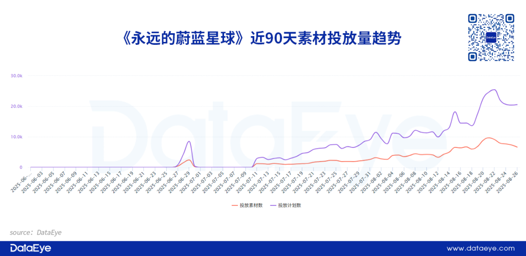 7月22日,《永远的蔚蓝星球》投放量升至1800条,而后素材量保持强势的上升趋势。8月21日当天素材投放量达到9600条,为投放以来峰值,对应计划数也高达2.4万组。从投放数量来看,近30天《永远的蔚蓝星球》素材投放量超过4.2万条,排名月投放榜单第6名。