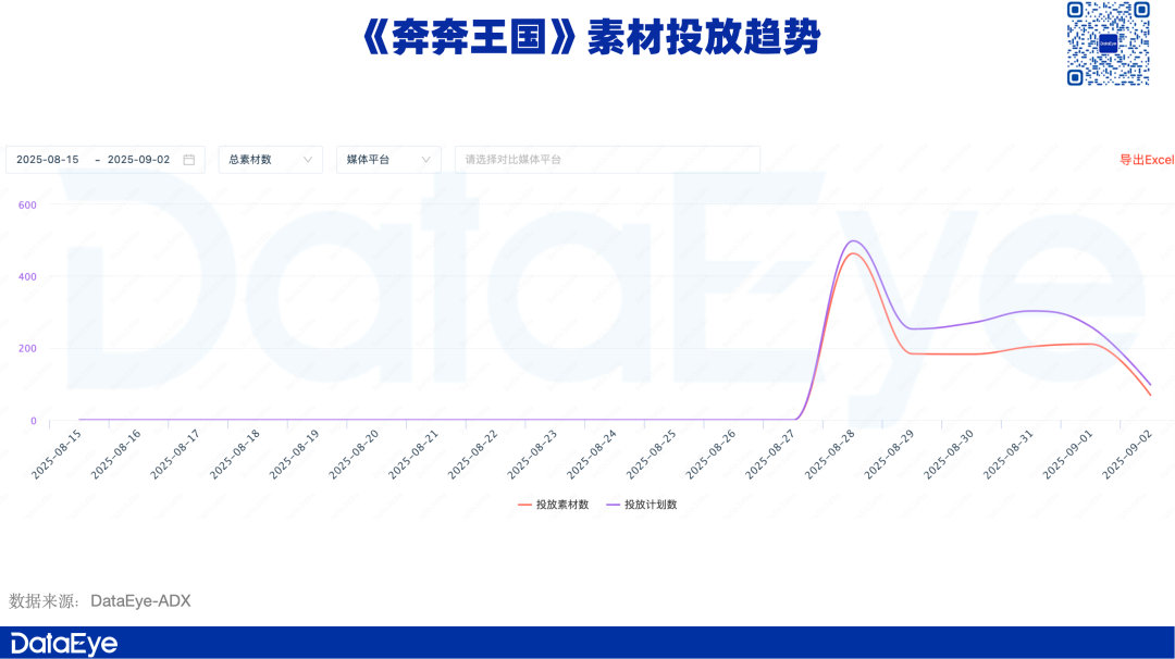 DataEye-ADX数据显示,《奔奔王国》从2025年8月底开始相关广告素材的投放,但整体素材投放量并不突出。